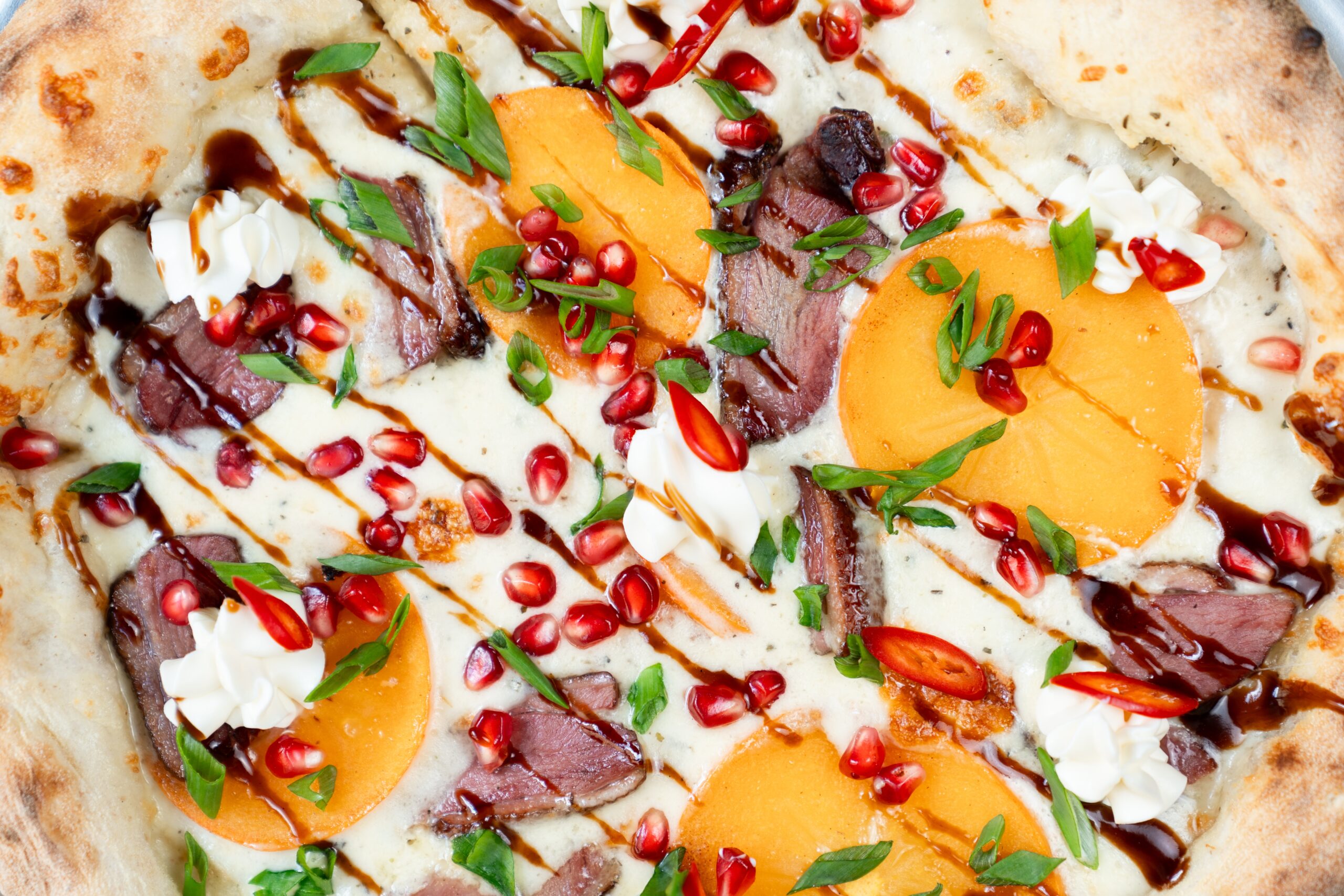 Тонке тісто, тягуча моцарела та соковите качине філе — це основа нашої піци з розкішним смаком. Солодкість хурми поєднується з легкою гостринкою чилі, гранатом та свіжою зеленою цибулею.